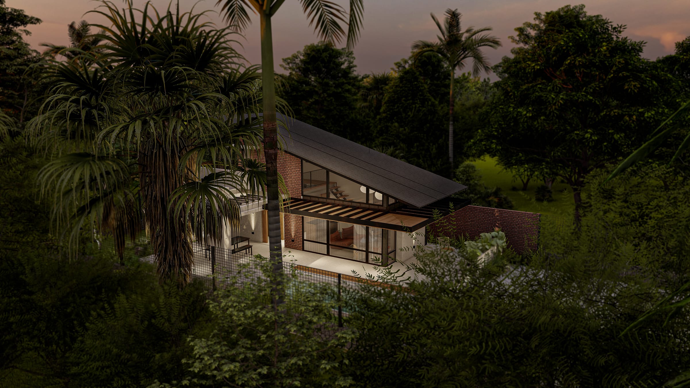 El proyecto surge con la intención de ofrecer a parejas un refugio compacto pero profundamente inmersivo, donde cada espacio fue diseñado para maximizar la experiencia del habitar. La vivienda se inserta respetuosamente en un terreno con pendiente natural, sin modificar su topografía ni intervenir la vegetación existente. Se eleva mediante un basamento que acompaña el desnivel, permitiendo que el terreno respire y el agua escurra. Algunos árboles atraviesan perforaciones en los aleros, reforzando la idea de una arquitectura que se adapta al entorno, y no al revés.